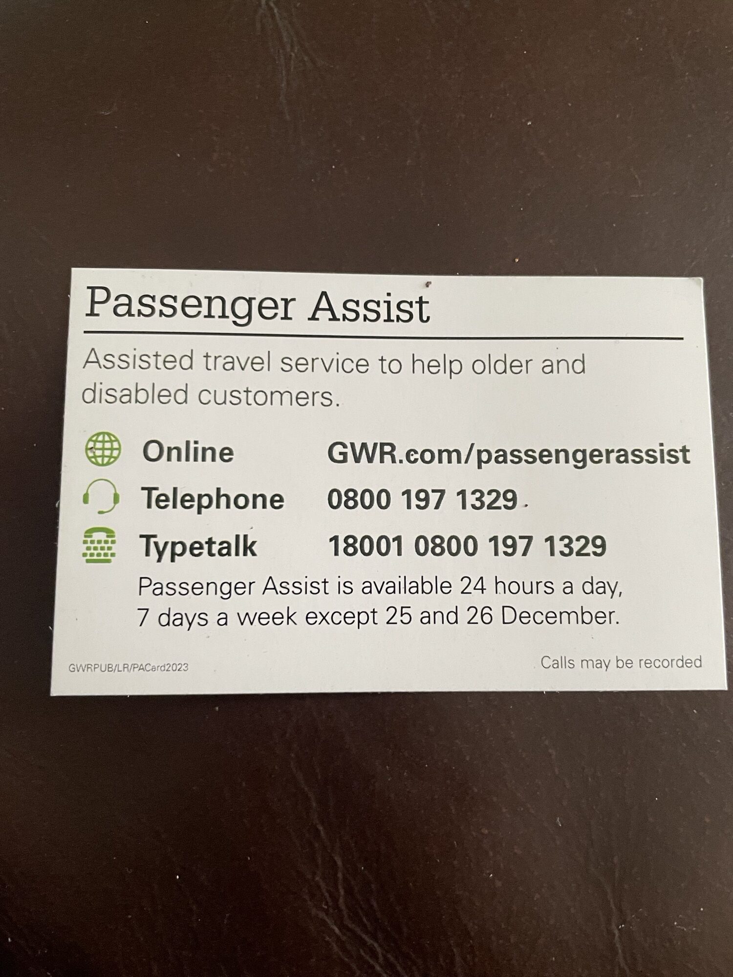 Passenger assist is a service provided by GWR enabling less abled people to travel confidently. Help is on hand to board & disembark the train with a ramp if needed. I have regained freedom & independence to create adventures. I’ve attached a photo of the contact information for you.
